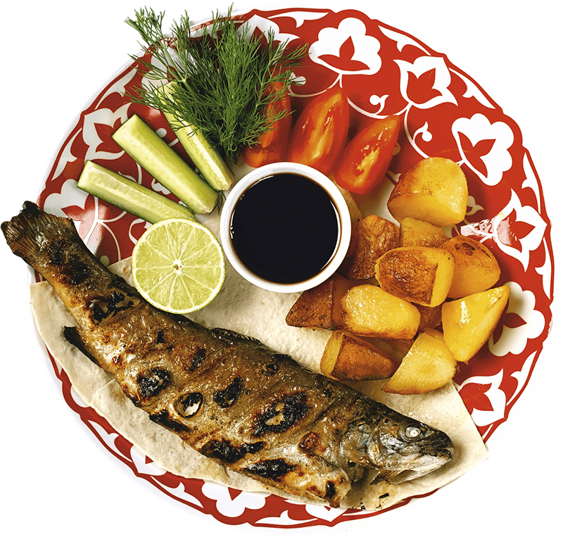 Шашлык из семги с гранатовым соусом «Наршараб» и картофелем «по-домашнему»